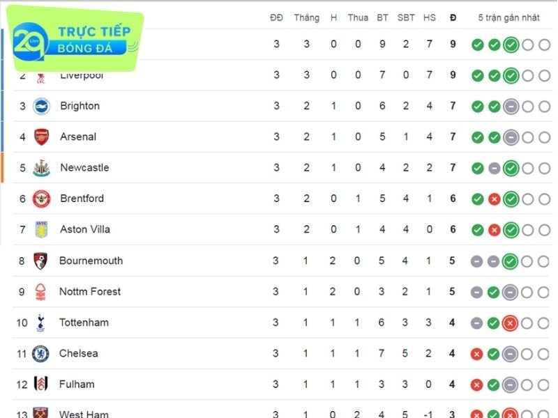 BXH Ngoại hạng Anh 2024/2025