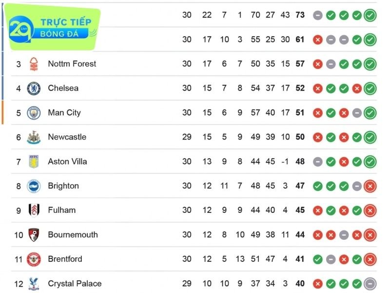 Bảng xếp hạng bóng đá Ngoại hạng Anh 2024/2025 mới nhất